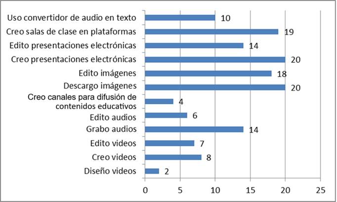 Las habilidades predominantes de los docentes en el uso de multimedia son la creación de presentaciones electrónicas y descarga de imágenes, pero también resaltan la creación de salas de clase en plataformas, edición de imágenes, grabación de audios y uso de convertidor de audio en texto.